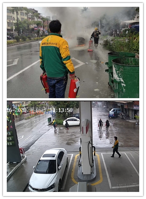 2020年02月16日下午13时许,南安市省新镇村民驾驶私家车途经“美福石油南永加油站”时,在加油站出口前方10米处发生车辆自燃情况;在此危急时刻加油站站长陈达新带领加油员王长源等人,迅速利用加油站的灭火器对自燃车辆进行灭火,控制了火势的进一步蔓延;在此期间共使用了多罐灭火器配合南安消防中队人员最终将火势扑灭,避免产生更大的财产损失。